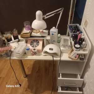 Стол, две лампы для сушки, настольная лампа, две машинки, лаки, сумка для работы и многое другое.